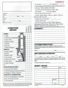 Your chimney cleaning log does not have a trained eye for the condition of your chimney and fireplace or wood stove. Consider this standard Condition Report that we fill out as a routine part of a chimney cleaning (Click image to enlarge:)