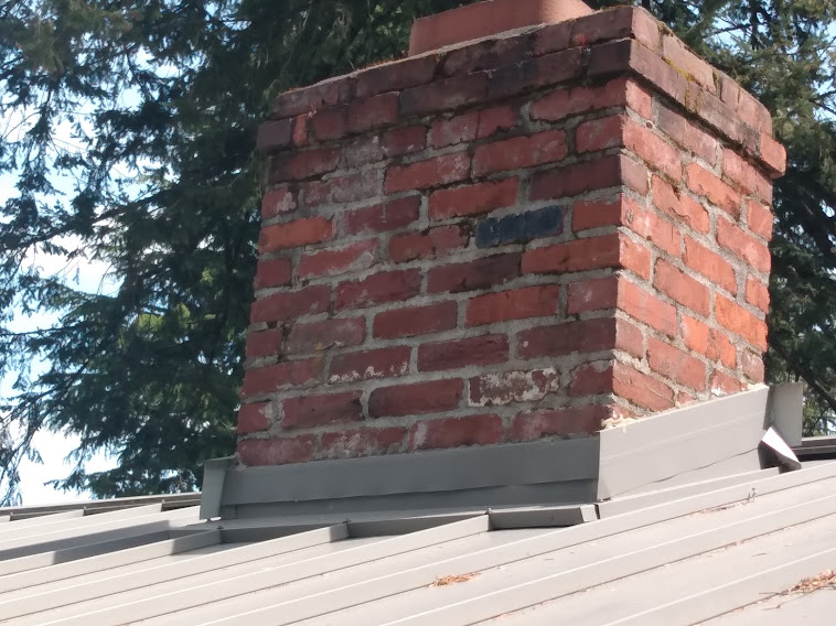 Chimney flashing is the pieces of metal at the bottom of the chimney, close to the roof. The flashing keeps water from running down the chimney into the house. Flashing that is missing or in bad repair can cause thousands of dollars of damage to the interior of the house (we have seen it happen.) Click here to learn what to look for.