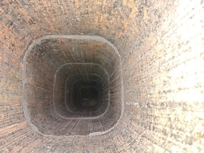 This chamber is larger than the actual vertical flue of the chimney that the smoke travels up. This space (the smoke chamber) is used to allow smoke to mix and curl in a circular motion and rise into the flue. The purpose of the smoke chamber is to compress the byproducts of combustion into a smaller space (the flue inside the chimney) without causing backdraft. This chamber can get very dirty with creosote deposits, and is cleaned from below using a long brush called a chamber brush. This chamber is usually (but not always) coated with mortar when the mason builds up the chimney. One of the reasons for coating this chamber is to smooth it out so that smoke can travel more easily up the chimney. The coating can wear away over time due to age, no rain cap on the chimney (rain thins the coating out over time,) and multiple chimney fires. Smoke chambers can be re-coated with high-temperature chamber coating mortars that are specific to our industry.